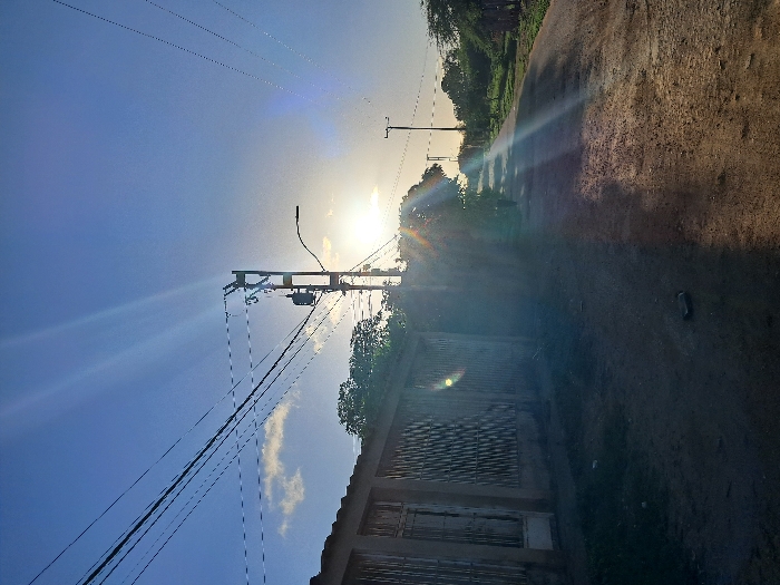 The photo depicts a sunny, rural scene with a road and trees on the right. A wall or building structure is visible in the foreground. Overhead, utility poles and power lines stretch across the bright blue sky, with the sun partially obscured by the infrastructure, causing lens flare. The image orientation is turned sideways.