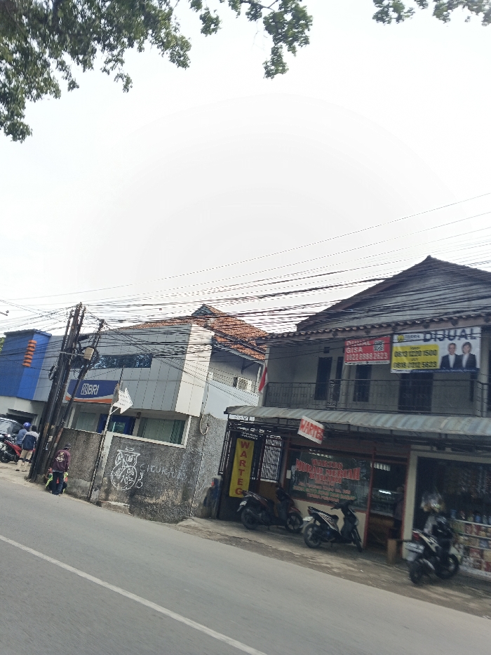 A street scene features a BRI bank building and adjacent two-story building with real estate advertisements hanging from its balcony. Several motorcycles are parked in front of a small storefront with a "WARTEC" sign. Graffiti adorns the concrete wall. Power lines crisscross above the buildings under a bright sky, partially obscured by tree branches. The image is taken from a slightly low angle from the street.