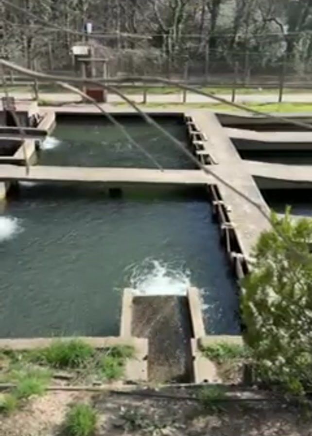 n elevated view of a trout farm with a series of concrete pools connected by small waterfalls. The water is clear and flowing. The pools are surrounded by concrete structures. In the background, there's a tree line and a wire fence. A small wooden structure is visible behind the pools. The video is shot during the day. Some green grass is seen surrounding the pools, but overall it appears to be early spring as the trees are bare.