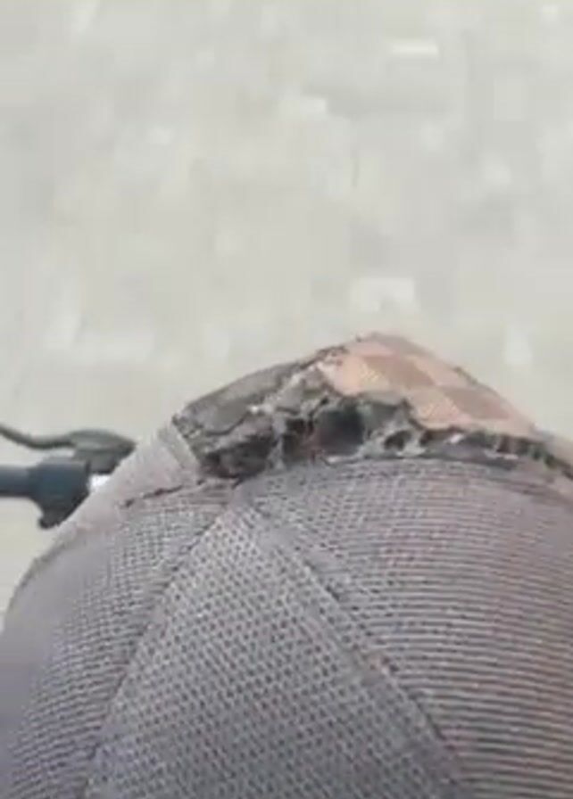 The video depicts a person riding a motorcycle on a paved road. The rider is wearing a colorful, patterned shirt. The road is marked with a white line and lined with streetlights. In the distance, there are buildings and vegetation. Another motorcyclist approaches from the opposite direction. The sky is light, suggesting either early morning or late afternoon. The video is shot from the rider's perspective, showing the handlebars and the road ahead.