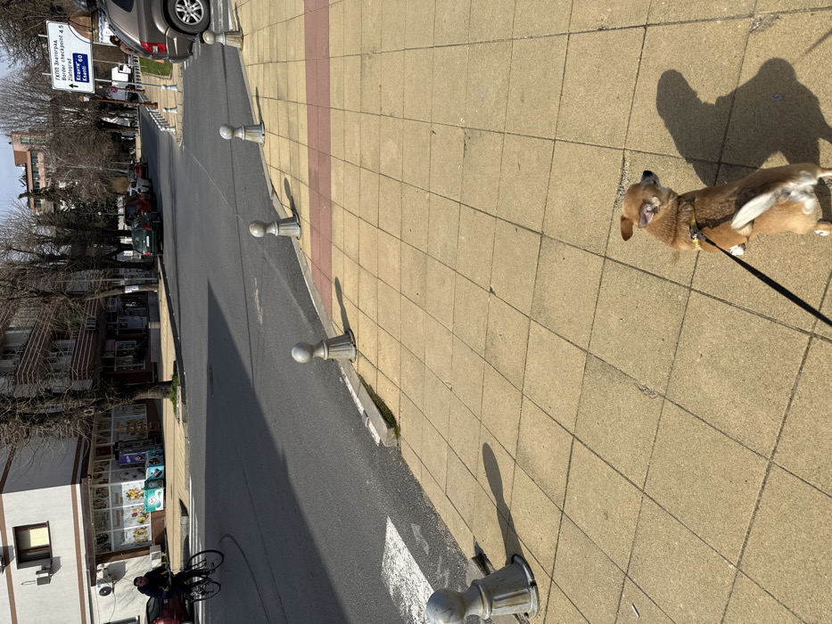 The image depicts an urban street scene in Zlatograd, Bulgaria, on a sunny day. In the foreground, a small, light brown dog with erect ears is observed from behind, standing on a leash on a tan-colored tiled sidewalk. The sidewalk features a strip of reddish-brown tiles. Five ornate, grey metallic bollards with spherical tops line the curb, separating the sidewalk from a dark asphalt road. On the asphalt road, a male individual wearing a dark jacket is riding a bicycle, turning left across a visible white pedestrian crossing. Shadows are cast across the road and sidewalk, indicating direct sunlight from the right. To the left of the road, a multi-story building with white and brown facades houses a ground-floor retail establishment, likely a grocery store, with various products visible through its large windows. An air conditioning unit is mounted on its exterior. Several bare deciduous trees line the street, suggesting either late winter or early spring. Further down the street, additional buildings and parked vehicles are visible, including a red car and a dark green car. To the right, a brown SUV is parked parallel to the curb. A white road sign with both Cyrillic and English text indicates directions to "ГКПП Златоград / Border checkpoint 4.5" and "Ксанти 60", confirming the location as Zlatograd and its proximity to the Greek border.