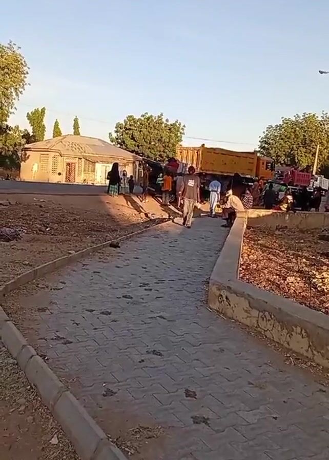 paved sidewalk leading towards a small gathering of people. Several individuals are visible near the sidewalk and a tan-colored building with a tiled roof. A large, yellow dump truck is parked in the background. The environment includes trees, a blue sky, and areas of dry, bare ground. People are walking around. It appears to be a casual outdoor setting in a rural or suburban area.