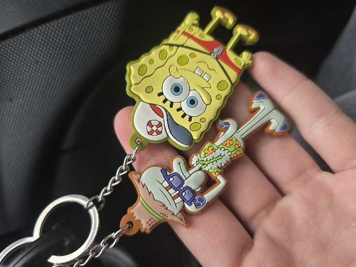 - "The image displays a close-up view of two rubber keychains, held by a human hand, likely within a vehicle interior in Sofia, Bulgaria" by FM-w5juZ2, licensed under CC BY 4.0