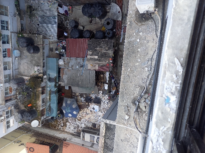 An overhead photograph captures a densely packed urban compound in Dar es-Salaam, Tanzania, viewed from an elevated position, likely a building window or balcony. The immediate foreground features a concrete window ledge, weathered with peeling paint, and a black window frame. Black electrical cables are visible on the ledge, some connected to an external air conditioning unit on the right. The central scene depicts an open-air courtyard-like area, heavily cluttered with debris, light-colored refuse, and various makeshift structures. The ground surface is uneven and covered extensively with trash. Numerous temporary shelters and extensions feature corrugated iron roofs, some rusted reddish-brown, others grey. One structure in the mid-left has a prominent greenish-blue tarp roof. A blue and white patterned umbrella provides shade in another section. The compound is characterized by the presence of multiple black plastic water storage tanks of varying cylindrical and squat designs, situated both on the ground and on lower rooftops. Two white satellite dishes are visible on a flat concrete rooftop in the upper-mid section. Piles of diverse waste and materials are scattered throughout. On the far left, the roof of a light-colored vehicle, possibly a van or car, is partially visible. The compound is surrounded by multi-story urban buildings, consistent with residential or mixed-use structures. These buildings feature numerous windows, some with security bars, and external air conditioning units mounted on their facades. Sparse, overgrown vegetation is present on some flat rooftops. No specific human figures or active interactions are discernible within the frame. The scene is illuminated by natural daylight, suggesting an overcast sky or diffuse lighting conditions.