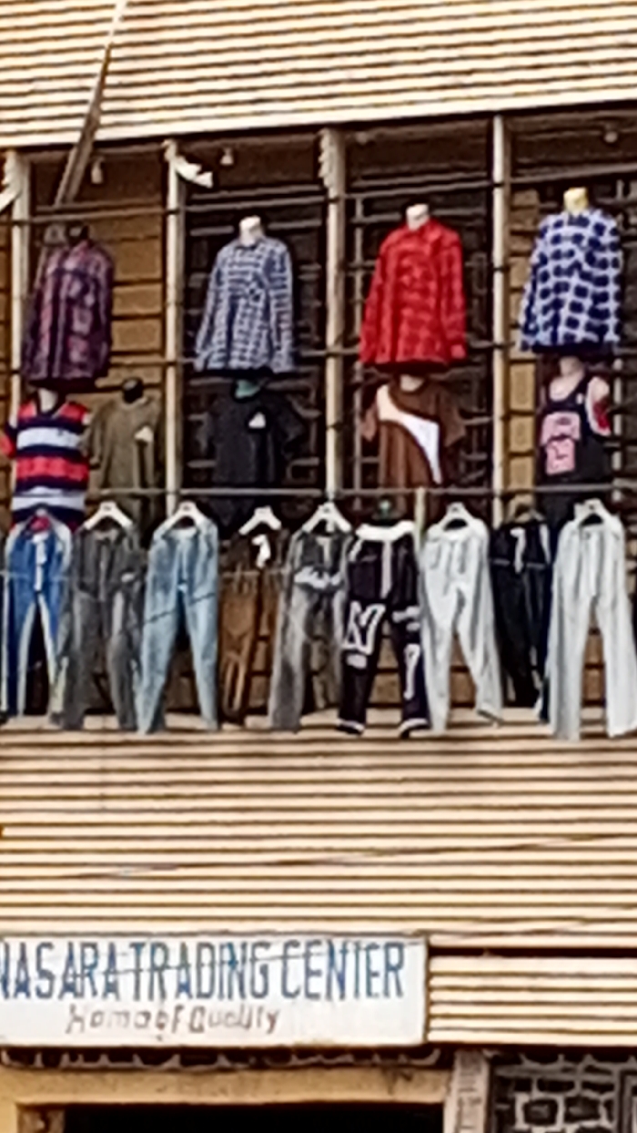 A storefront, "NASARA TRADING CENTER, Home of Quality," is shown in Maiburiji, Nigeria. Clothing is displayed on hangers and mannequins in the shop's windows. The store is a simple, possibly older structure with a light-colored facade.