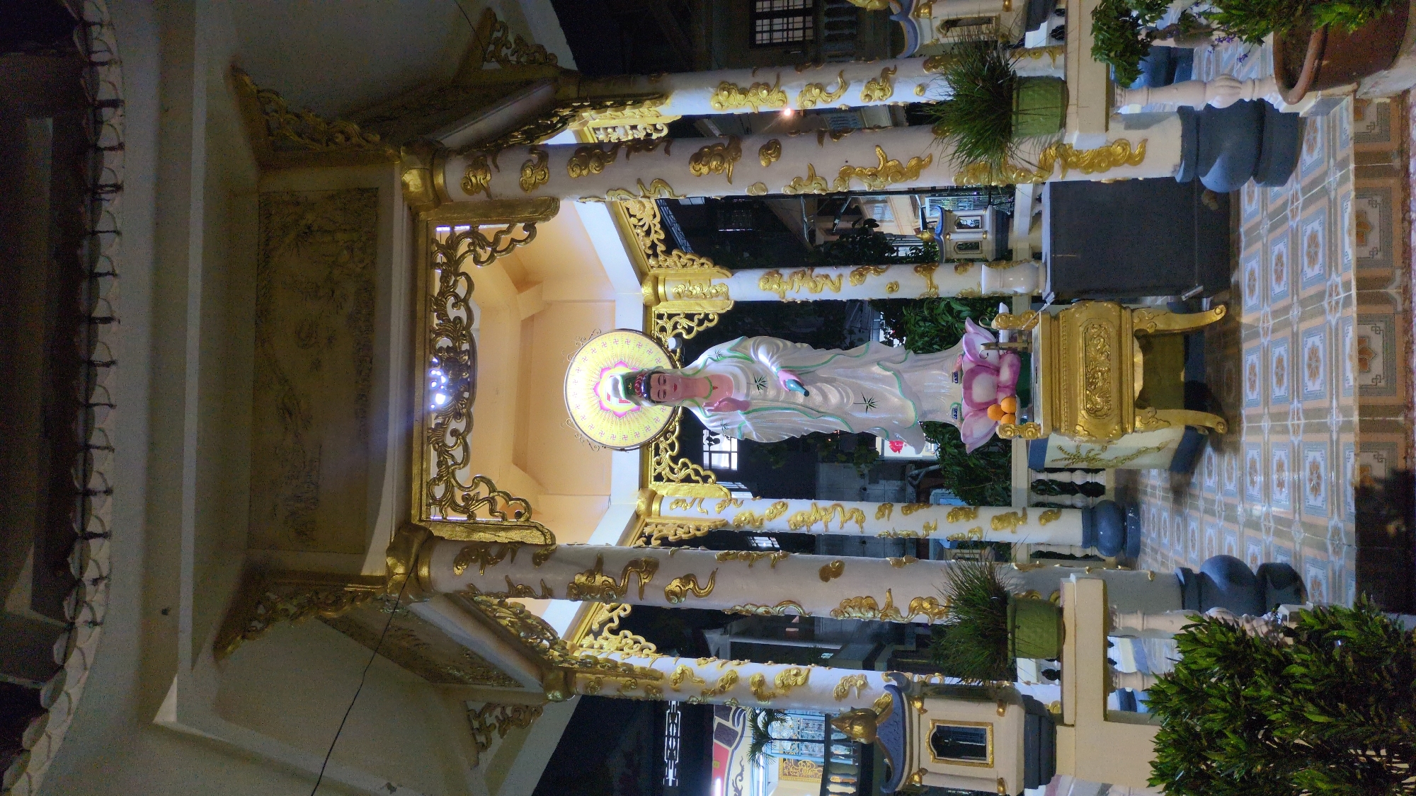 The image depicts a statue of a deity, likely Guanyin, inside a temple or shrine