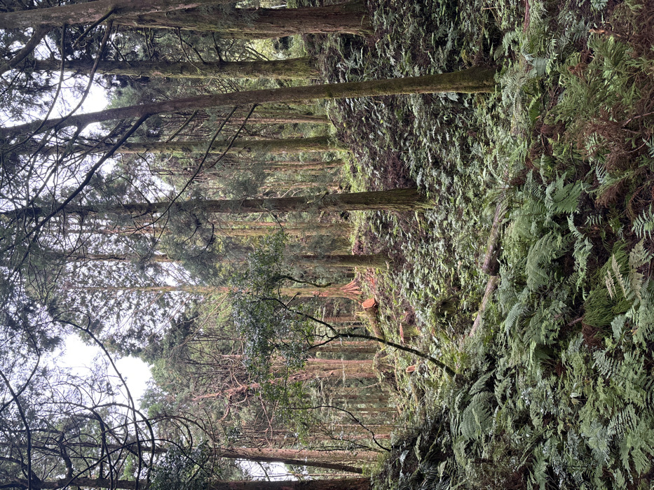 This image depicts a dense coniferous forest in Alishan Township, Taiwan