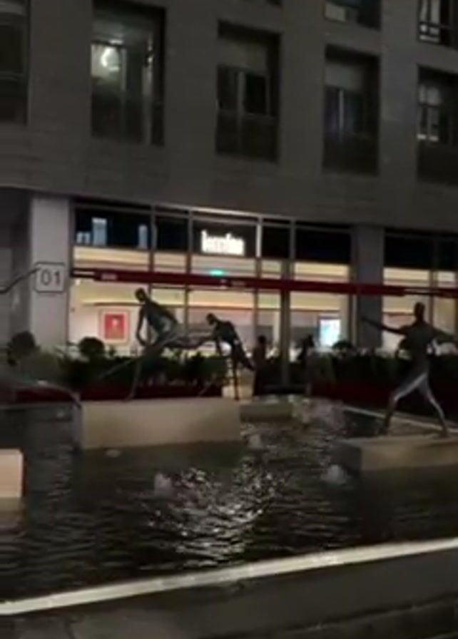 dark outdoor scene at night. In the foreground is a rectangular water feature with multiple small fountains. Bronze-colored statues of people in dynamic poses are placed on platforms within the water. Behind the water feature is a building with a modern facade, and illuminated windows. A sign that reads "le Relais" is also visible on the building. A few people can be seen through the windows of the building. The camera is relatively still.