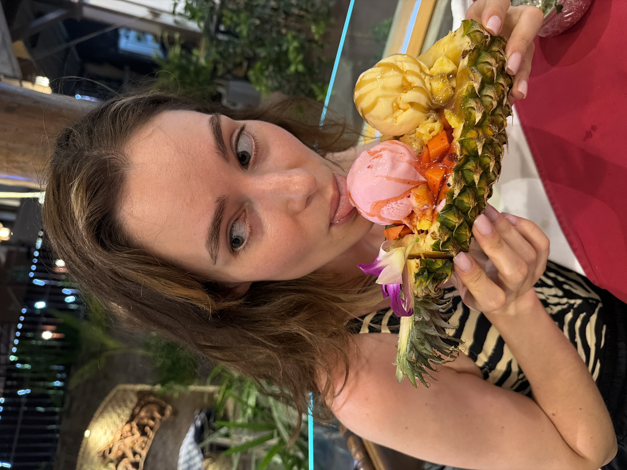 A young adult female, with long brown hair and wearing a black and white zebra-print top, is depicted in a semi-outdoor dining setting in Patong, Thailand. She holds a halved pineapple containing two scoops of ice cream—one pink, one yellow with caramel drizzle—alongside diced fruit and a purple orchid garnish. Her tongue is extended, making contact with the pink ice cream scoop. Her eyes are directed towards the right side of the frame. The immediate foreground features a red tablecloth. The background, blurred, shows green foliage, decorative lighting, a carved wooden archway, and structural wooden elements, suggesting an evening ambiance.
