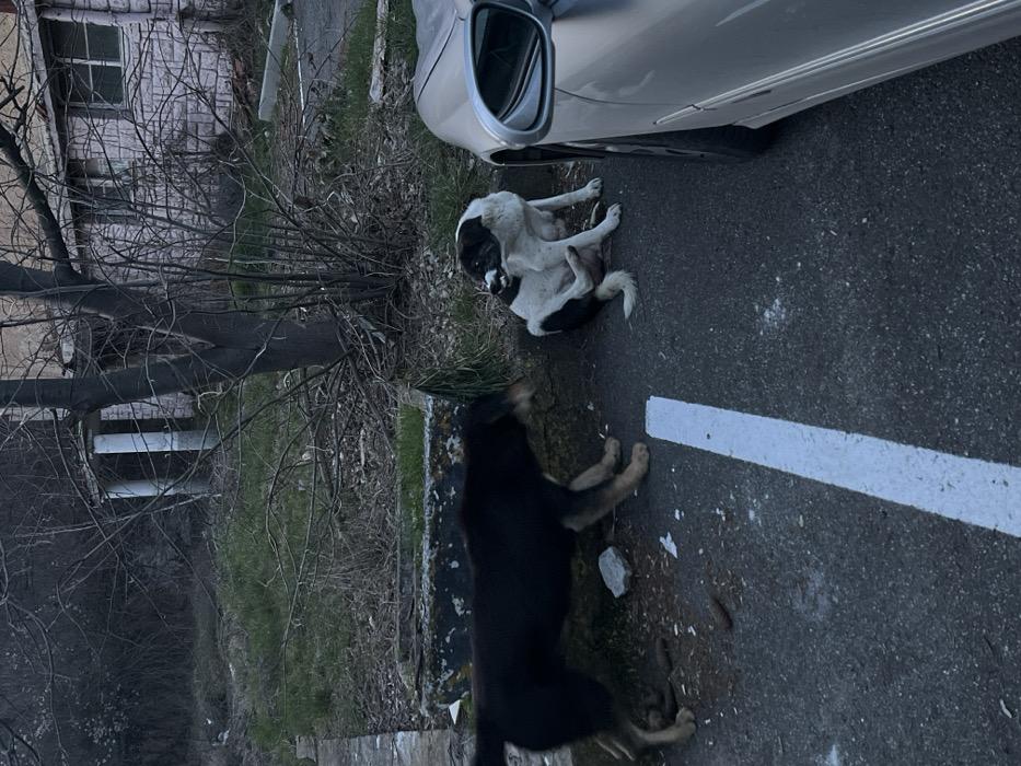 The scene depicts an outdoor urban environment in Ardino, Bulgaria, characterized by neglect. In the foreground, two dogs are positioned on dark asphalt pavement, which features a faded white parking line running vertically. The dog on the left is predominantly dark brown or black with lighter, possibly tan, markings on its legs and snout, standing on all four legs and facing towards the right. The dog on the right is black and white, seated on its hindquarters next to a light-colored, possibly silver, sedan. This black and white dog is actively scratching its right ear or neck area with its raised right hind leg, its mouth slightly open with teeth visible. The front passenger side of the car, including its side mirror, is visible on the far right. Behind the dogs and asphalt, a low, weathered concrete barrier separates the paved area from an unkempt patch of overgrown grass, scattered debris, and sparse, leafless bushes and trees. In the background, a two-story building with a light pink or peach textured facade is partially visible. The building shows signs of disrepair, including a structure on its left featuring two white, fluted columns suggesting a portico, and visible windows. The overall lighting suggests either dusk or an overcast day.