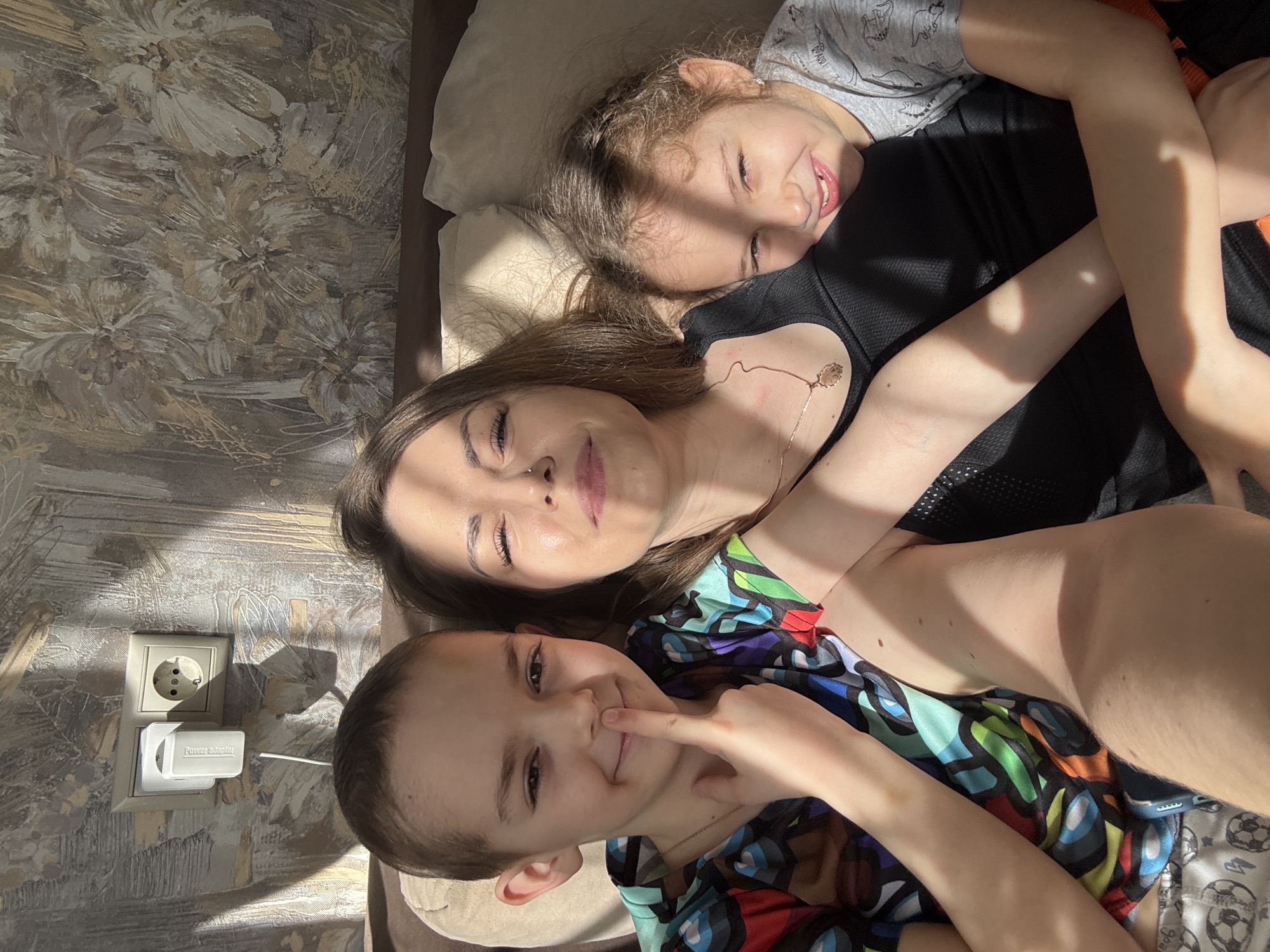 Three individuals are lying together on a bed. A woman with long brown hair is positioned in the center. To her right is a young girl wearing a grey t-shirt. To the left of the woman is a young boy wearing a brightly colored shirt. The boy is pointing to his nose. An electrical outlet and power adapter are visible on the wall next to the bed. The location is Раздолье, Russia.