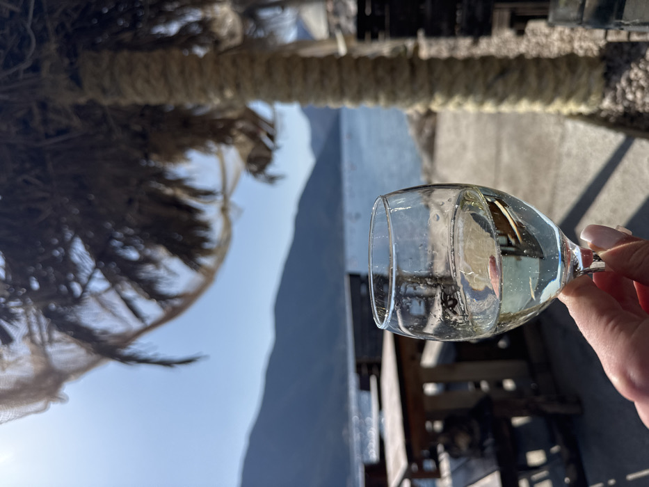 A close-up, eye-level shot depicts a human hand, identifiable by light pink manicured fingernails, holding a stemmed glass containing a clear, light-colored liquid with visible condensation droplets and air bubbles. The glass is positioned centrally in the lower portion of the frame, partially obscuring the midground. Reflections of the surrounding environment are visible within the liquid. The immediate background consists of a concrete or paved surface leading to a body of water, likely a bay, under a clear blue sky with a high sun. To the left of the glass, an unoccupied rustic wooden table and matching bench are visible. To the right, a thick palm tree trunk, wrapped with rope-like material, rises vertically, its blurred fronds extending into the upper right. Across the calm water, a prominent range of dark blue mountains forms the distant horizon. The scene is an outdoor setting, likely a waterfront establishment, in Dražin Vrt, Montenegro.