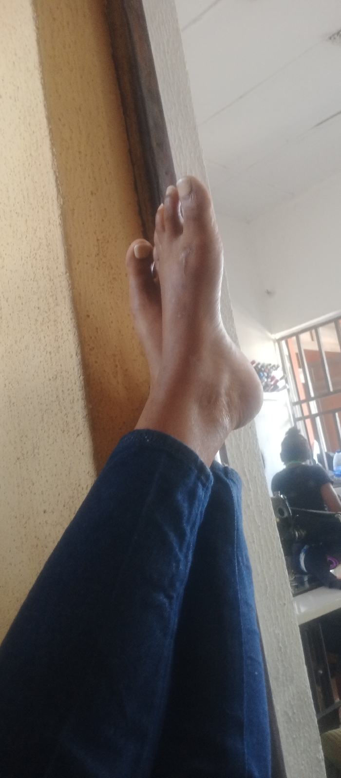 The image depicts an indoor scene from a low-angle perspective. In the immediate foreground, two bare feet, belonging to an individual wearing blue denim pants, are positioned against a textured, light beige vertical surface. The feet are angled upwards and to the right. In the background, visible through an opening to the right of the foreground wall, a second individual is seated, viewed from behind. This person has dark hair secured in an upward style, wears a dark shirt, and has a light-colored strap or cord around their neck. They are seated at a dark-colored machine, consistent with a sewing machine, placed on a table. Behind the seated person, a window with horizontal bars is visible, admitting ambient light. To the left of the window, various objects are stacked or placed on shelves. A plastic bottle is also present on the table near the seated individual. The ceiling overhead is white with visible linear paneling. The scene is located indoors within the city of Unknown, Unknown.