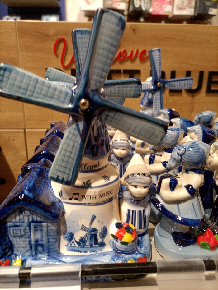- "The image presents a close-up, eye-level view of Delftware-style ceramic souvenirs on display in a retail setting within Schiphol, Netherlands" by FM-z1qg42, licensed under CC BY 4.0