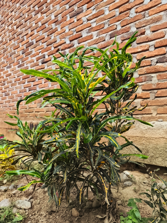 - "The image displays an outdoor scene in Teumpokteungku, Indonesia, focusing on a variegated plant against a brick wall" by FM-RPcK62, licensed under CC BY 4.0