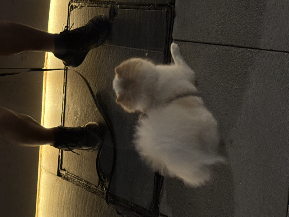 The image depicts a low-angle view of a person and a dog on a paved surface during dim lighting conditions, likely evening or night. The lower legs and feet of a single individual are visible at the top of the frame, wearing dark athletic sneakers. The person stands over two rectangular, dark metal grates embedded in the paving. A small, fluffy dog, predominantly white with light brown markings, is positioned in the foreground, sitting or lying on the ground. The dog is facing away from the viewer, looking towards the person's feet. A dark leash extends from the dog towards the person's general vicinity. The ground is composed of large, uniform paving slabs. An ambient, warm light source, possibly upward-facing, illuminates a vertical surface in the background behind the person's legs, creating a yellowish glow. The specific location within the city of Dubai, United Arab Emirates, cannot be determined from the visual information provided.