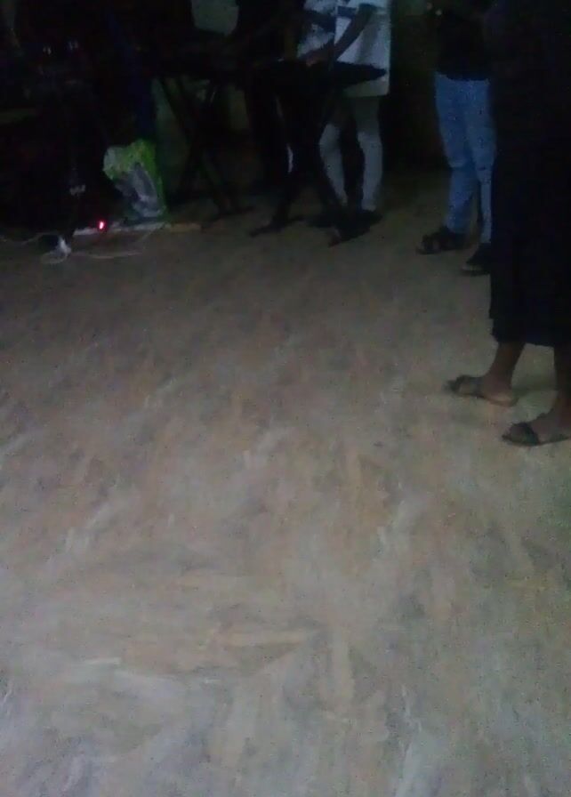 dimly lit room with a tiled floor. Several people are present, though they are mostly out of focus. A chair and other objects, including what appears to be a box, are visible in the lower left corner of the frame. The video is oriented sideways, with the foreground dominated by the floor. The overall image is grainy and lacks clear detail. There is a light, possibly from an electronic device, that can be seen flashing.