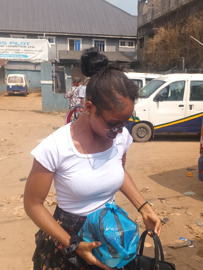 A woman with her hair in a bun and wearing sunglasses, a white t-shirt, and a dark floral skirt stands in a dirt lot. She holds a blue plastic bag in one arm while reaching for a black purse. A white van with a blue and yellow stripe is parked behind her. In the background, a building with a grey metal roof is visible. A sign reads "US PILOT ND LOGISTICS LTD," followed by details regarding mini buses and booked travels. Another smaller van is partially visible in the distance.