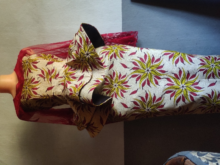 An indoor scene in "Unknown, Unknown" shows a full-length mannequin displaying a two-piece women's dress. The mannequin, depicted from the upper chest downwards, presents a light brown, flesh-toned neck and décolletage. The dress comprises a peplum-style top and a matching long, fitted skirt. The fabric is a cream-colored textile patterned with repeating circular motifs of yellow and red stylized leaves, interspersed with smaller maroon leaves. The top features a red lace overlay on the upper chest and long, sheer red lace sleeves. A multi-layered peplum flares from the waist, with its underside lined in a dark material, possibly black. The skirt is a straight, form-fitting design, extending to approximately the ankle, utilizing the same patterned fabric as the top. The background consists of a plain wall, horizontally bisected by a paint line. The upper section of the wall is light grey, while the lower section is dark grey. A small portion of a patterned object, featuring blue and dark brown designs, is visible in the lower-left corner of the frame, likely part of a cushion or piece of furniture. The scene is static, with no visible actions or interactions.