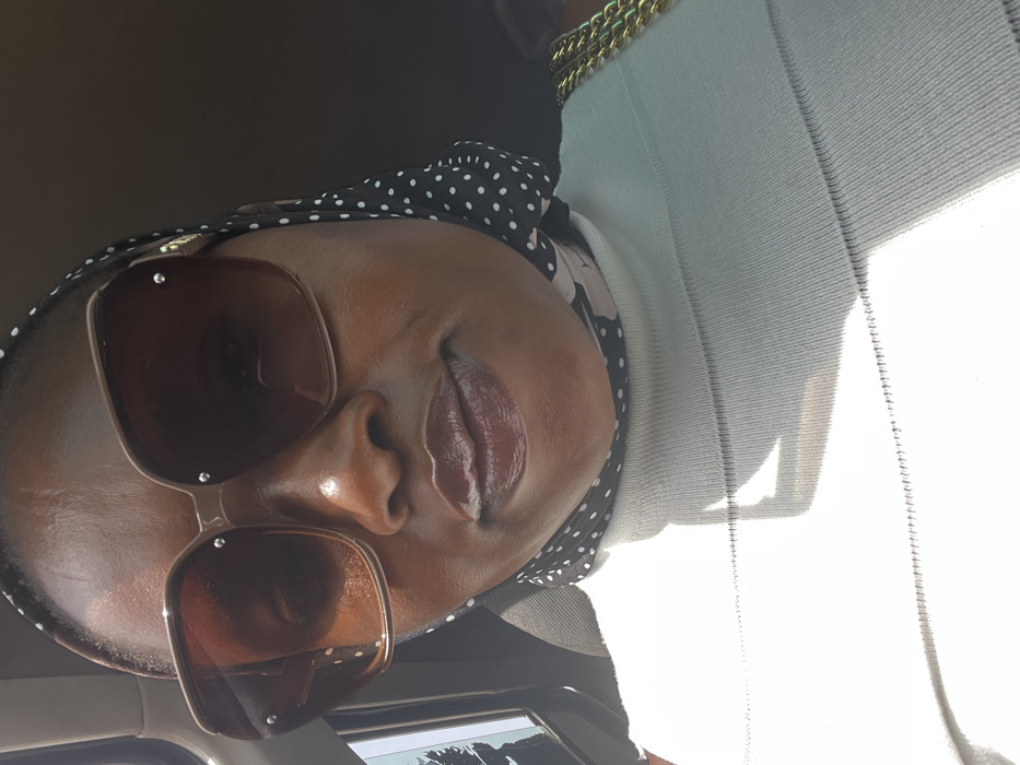 A close-up, head-and-shoulders portrait depicts an individual with dark skin, positioned indoors, likely within a vehicle, as evidenced by a window and interior panel visible on the left