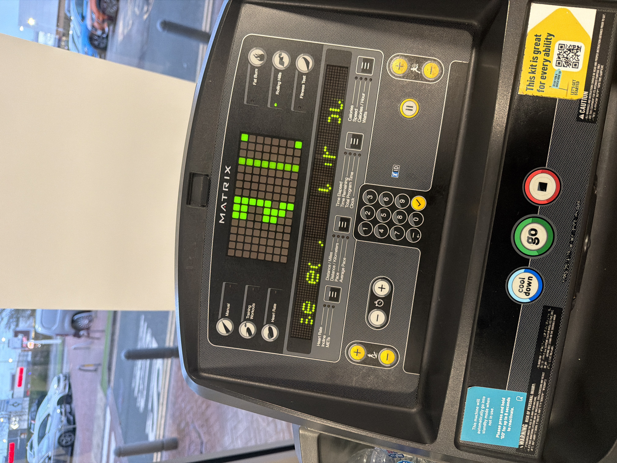 - "The image depicts the control panel of a black Matrix brand treadmill, positioned indoors facing a window" by FM-1FhX33, licensed under CC BY 4.0