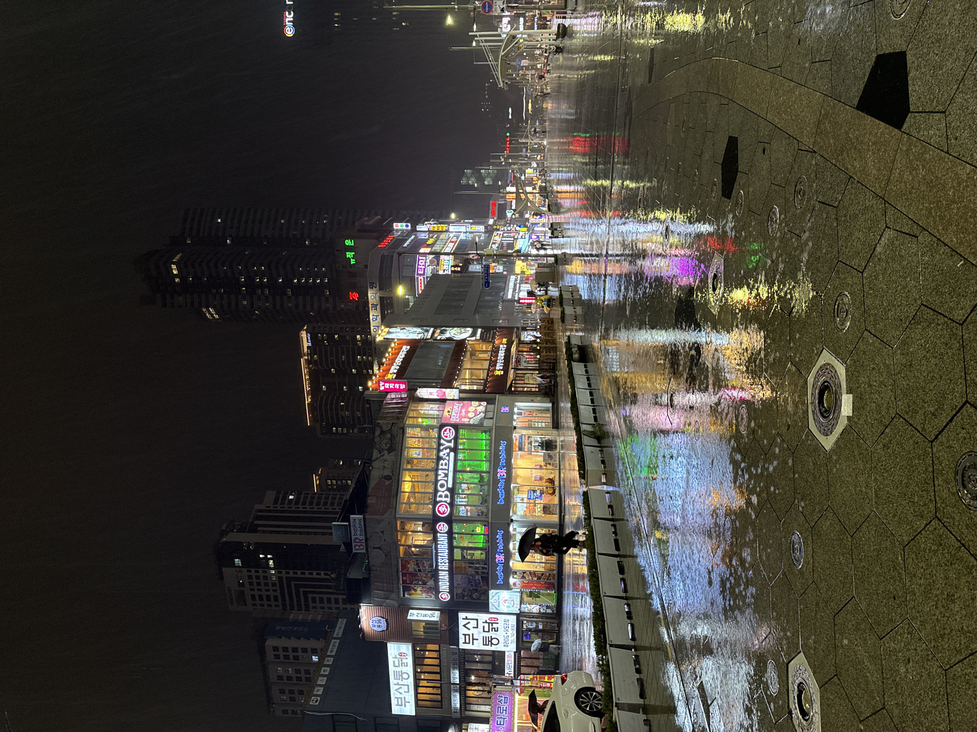 The image depicts a rainy night scene in Busan, South Korea