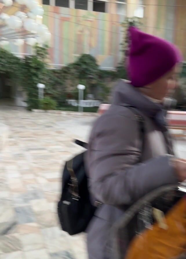 person in a pink beanie and gray jacket walking past a table with a person sitting and writing at it. The person in the beanie has a black bag over their shoulder. The scene is in a large indoor space with a marble floor and various plants and benches. There are displays with papers on them in the background.