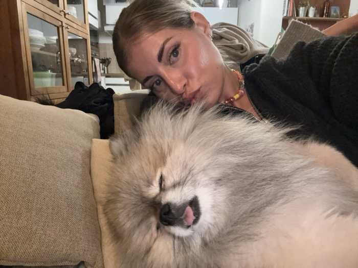 This image depicts an indoor domestic scene, inferred to be located in the city of Lille, France. The primary subjects are an adult female and a small dog, occupying the foreground and midground. The woman is positioned on the left side, angled towards the right. She has light-colored hair pulled back, a visible left eye with dark eyeliner, and her lips are pressed into a pouting expression. She wears a dark, possibly knitted or fuzzy, zippered garment and a colorful beaded necklace around her neck. Her head rests close to a light beige upholstered surface, likely a sofa or large pillow. To her right, partially obscured, is a small Pomeranian dog with fluffy light grey and cream-colored fur. The dog is lying on its back or side, eyes closed, with a small pink tongue slightly protruding from its mouth, indicating sleep or deep relaxation. It rests on the same light beige upholstered surface as the woman. A matching pillow is visible to the left of the dog. In the background, to the left, a wooden cabinet with glass doors displays white ceramic plates and other kitchenware. Further back, a kitchen area with light-colored wall tiles and shelves holding various items is visible. The lighting is consistent with an interior setting. The woman appears to be leaning over or resting next to the sleeping dog, creating an intimate interaction.