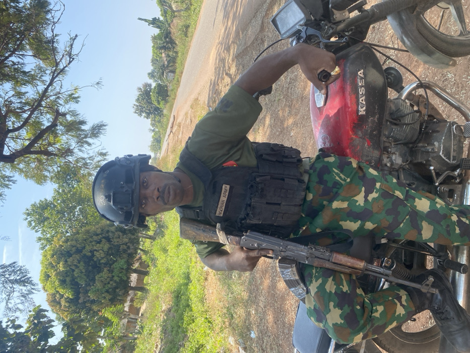 An adult male, identified by a "NIGERIAN ARMY" patch on his chest, is seated astride a red and black KASEA brand motorcycle on an unpaved road in Wukari, Nigeria