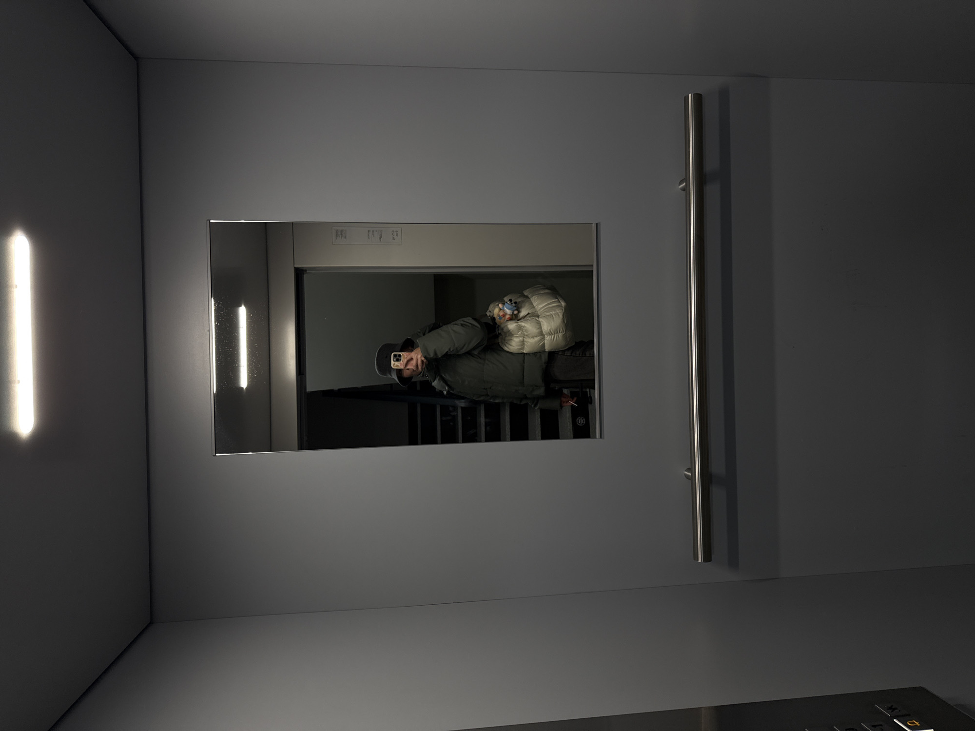 A photograph shows an interior space with smooth gray walls and minimalist design elements. The scene appears to be within an elevator car, with a rectangular mirror mounted on one wall. The mirror reflects the image of a person holding a smartphone, presumably taking a photograph of themselves. The person is wearing a dark jacket and a light-colored puffer-style hat. The background visible in the mirror suggests a stairwell or another part of a building. To the left of the mirror, a vertical strip of light is built into the wall. To the right, a brushed metal grab bar is installed vertically. The foreground shows a portion of the elevator's control panel with buttons. The setting suggests a modern, possibly recently renovated, building in Vozdovac Urban Municipality, Serbia.
