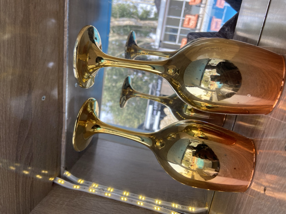 Four inverted, reflective metallic-gold wine glasses, featuring a copper-toned gradient at their bases, are positioned on a light brown wooden surface