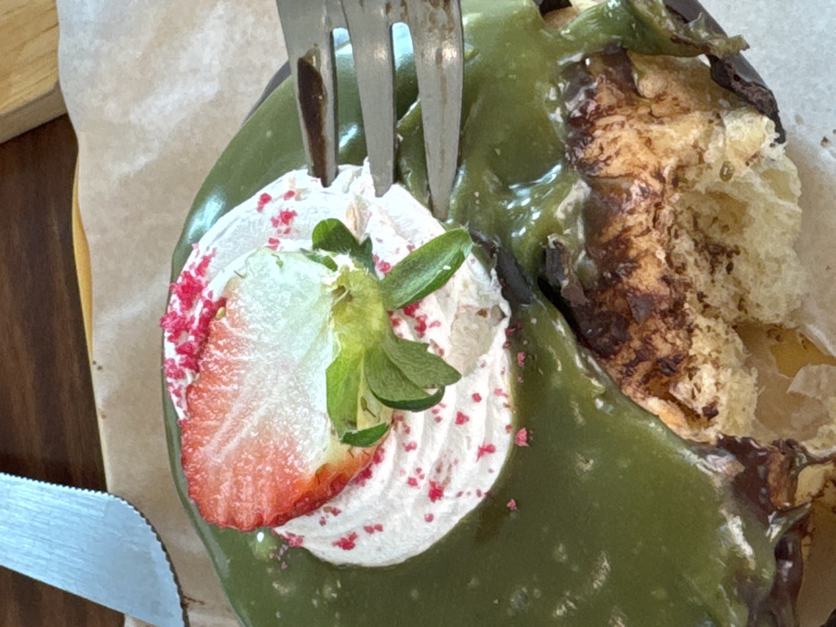 A close-up, overhead view depicts a partially consumed dessert item situated on a light brown paper lining, which rests on a dark brown wooden surface. The dessert features a dark base, extensively coated with a thick, glossy, jade-green glaze. A swirl of white whipped cream is centered atop the green glaze, adorned with a lengthwise-sliced fresh red strawberry half, its green calyx intact. Small, bright red granular sprinkles are scattered across the whipped cream and adjacent glaze. A bite has been taken from the lower right portion of the dessert, exposing a light tan, crumbly interior with darker brown sections. A silver-colored fork with three visible tines is actively inserted into the dessert from the right side. In the upper left corner, the serrated blade of a silver-colored knife is visible on the paper. No individuals are present in the frame. The scene is located in San Phra Net, Thailand.