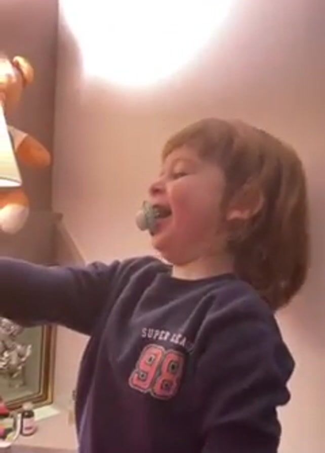 A young child with light brown hair, wearing a navy blue sweatshirt with "Super League 98" printed on it, is seen in a close-up, low-angle shot. The child has a pacifier in their mouth and is laughing hysterically, with their mouth open wide. In the background, there is a wall with a shelf containing a framed picture, small bottles, and some papers. To the left of the child, slightly out of focus, is a stuffed teddy bear wearing a white outfit. The lighting is bright, and the room appears to be indoors.