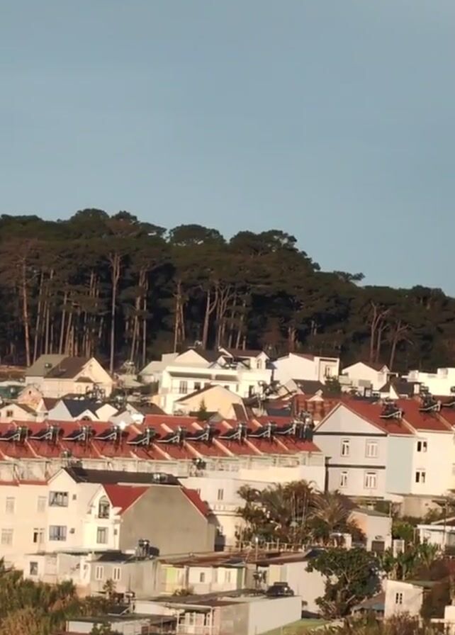 hillside town with many white buildings and red tile roofs. Behind the town is a forest of tall, slender trees. The sky is clear and blue. The buildings are densely packed together, and some have solar panels on their roofs. The trees appear to be pine trees. The video appears to be shot from an elevated position looking down on the town.