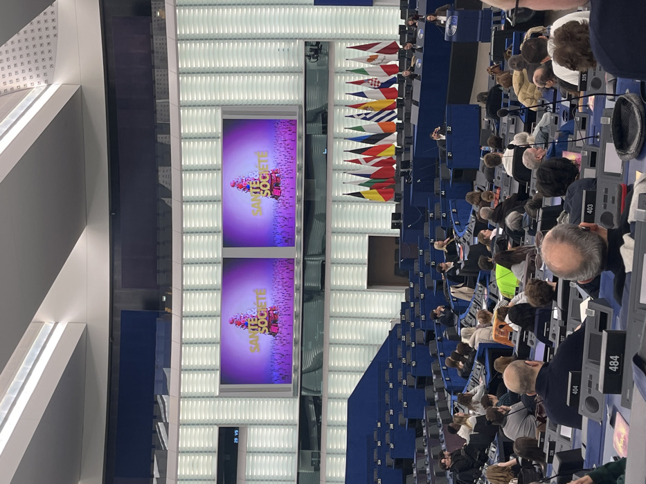 plenary chamber of the European Parliament building in Strasbourg, France. The scene captures a large, modern assembly hall with tiered, semicircular rows of blue seats, many occupied by individuals. Each seat includes a desk with a microphone and a numerical identifier (e.g., "404", "484"). In the foreground, the backs of numerous attendees' heads are visible, most facing towards the front of the chamber. At the front of the hall, above a speaker's platform, two large rectangular screens are prominently displayed. Both screens show identical graphics: the French phrase "SANTE & SOCIETE" (Health & Society) in yellow capital letters, set against a purple background. Beneath the text, an illustration depicts stacked red and gold gift-like boxes or structures on a pedestal, surrounded by numerous small, indistinct human silhouettes. Behind the speaker's platform, a row of national flags from various European countries is arranged vertically. Observable flags include those of Belgium, Denmark, Germany, France, Greece, Croatia, Italy, and Latvia. The chamber's walls feature distinctive vertical white louvered panels, and the ceiling includes linear light fixtures. Attendees are seated and observing the front of the chamber; no specific actions or interactions among the audience are discernible.
