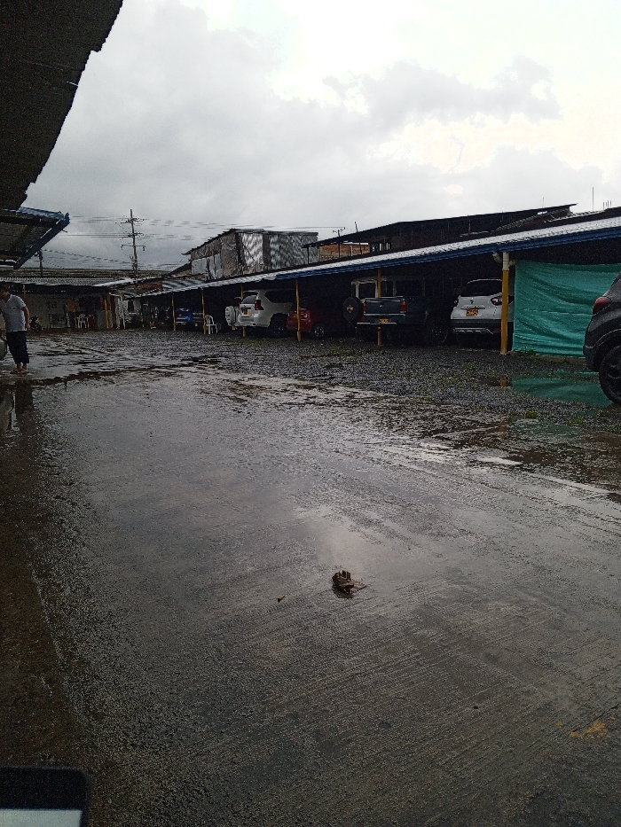 A wet, paved area leads to a covered parking area with several cars underneath