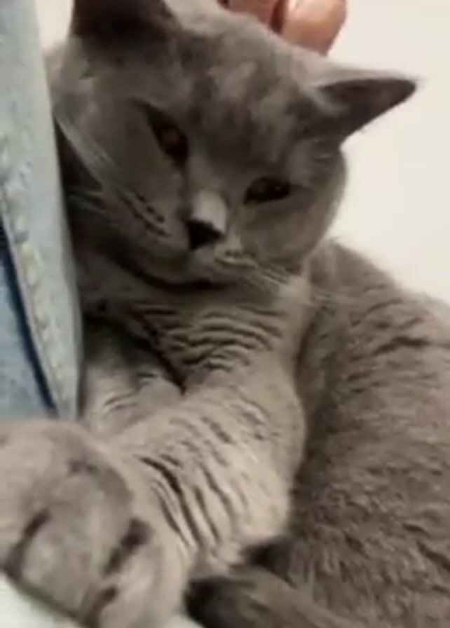 A close-up shot displays a gray cat being petted on the head by a human hand