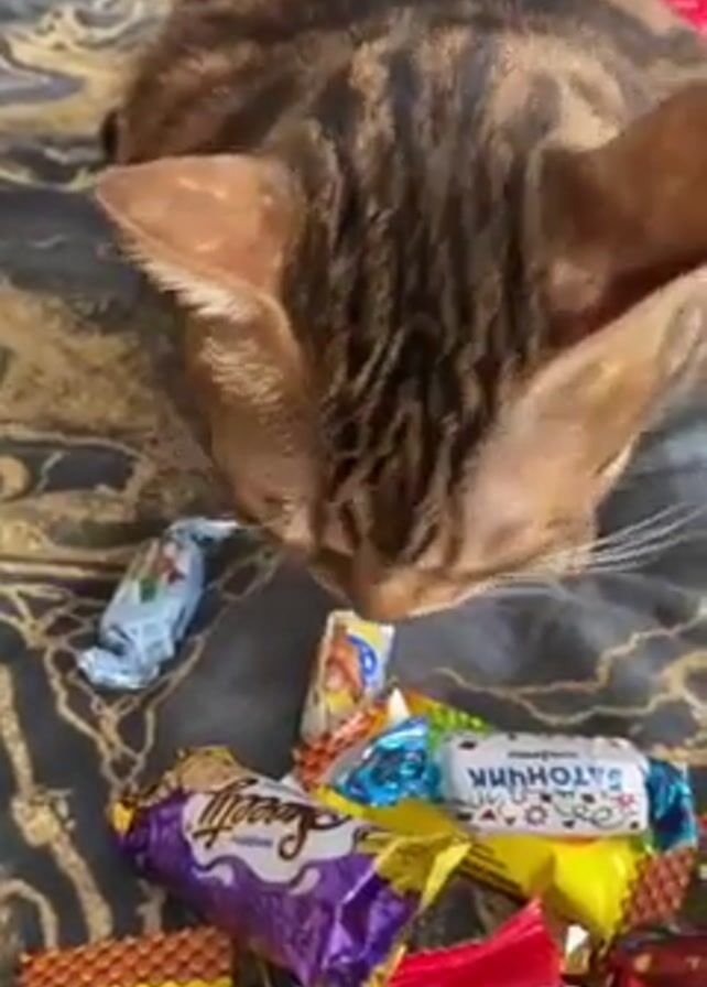 - "A brown and black tabby cat is sniffing at a pile of wrapped candies spread out on a bed with a dark patterned bedspread" by FM-dIZzh1, licensed under CC BY 4.0