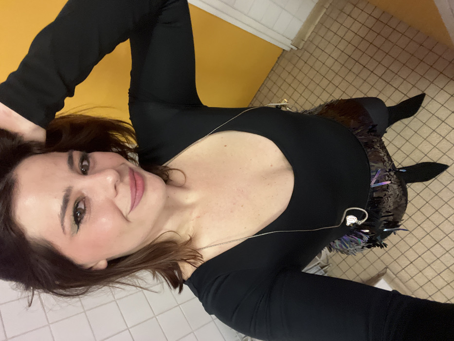A woman poses for a selfie in a room with yellow walls and tiled floors. She wears a long-sleeved black top and a dark, shiny skirt with iridescent accents. Her dark hair is styled loosely, and she wears light makeup. A silver necklace and in-ear monitors adorn her neck. She is smiling, and her head is tilted, creating a casual, playful pose.