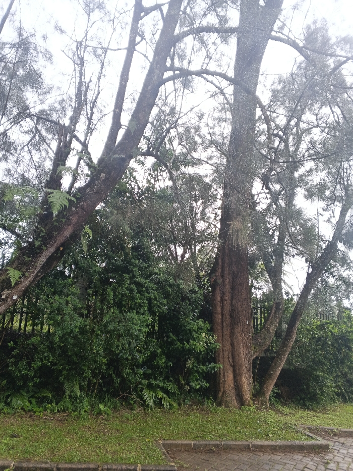 This image depicts a natural outdoor scene in Matopos, Zimbabwe. The upper portion of the frame is dominated by an overcast, light grey sky and the upper branches of several large, deciduous or sparsely leaved trees. A substantial tree with a thick, textured brown trunk leans significantly from the left side of the frame towards the center, displaying green ferns and mosses attached to its bark. To the right, another large tree with a thick, straight trunk, also appearing textured and brown, rises vertically. Dense green foliage, comprising shrubs, bushes, and smaller ferns, fills the middle ground, extending across the entire width of the frame and obscuring the base of the trees and any distant background. Partially visible through this dense vegetation, particularly on the left and center-right, is a dark fence. The foreground features a narrow strip of mown green grass, beyond which lies a paved area composed of rectangular interlocked bricks or pavers, delineated by a grey curb. No people, animals, or active events are present in the scene.