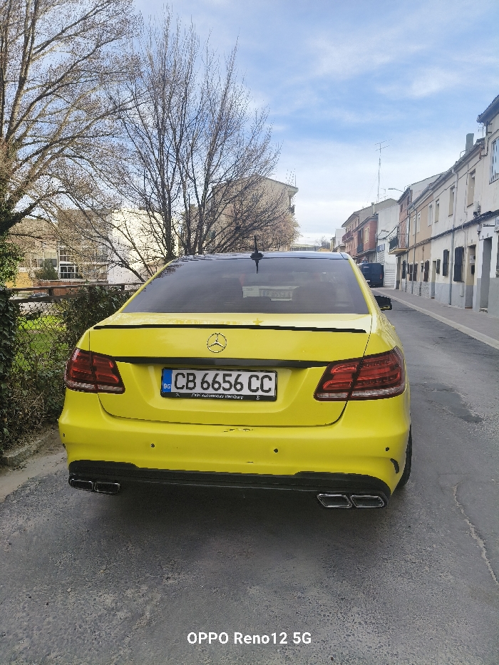 - "A bright yellow Mercedes-Benz E-Class sedan (W212 generation) is parked from a rear perspective on a gray, paved street in Cuéllar, Spain" by FM-VDlEK2, licensed under CC BY 4.0