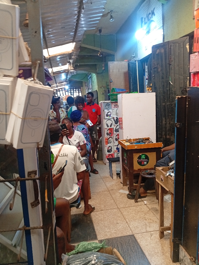 This image depicts a crowded indoor market or commercial passage in Fegge, Nigeria