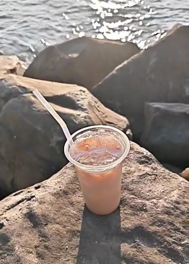cup of iced coffee sitting on a rock. The coffee is in a clear plastic cup with a lid and a white straw. Behind the cup, there are several other rocks leading to a body of water that is sparkling in the sunlight. The scene appears calm and peaceful. The camera tilts upwards to show the expanse of the water and the horizon.