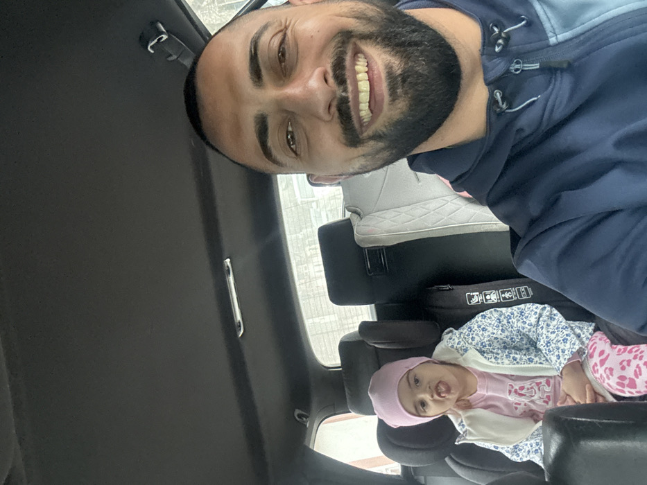 An adult male and a young child are observed inside a vehicle in Gorna Oryahovitsa, Bulgaria. The image appears to be a selfie taken by the adult male, who is positioned in the foreground on the right. He is a male with dark hair, a full beard, and is smiling broadly, exposing his teeth. He wears a two-toned blue zip-up hoodie. A young female child is seated in the rear left passenger seat, secured in a dark-colored car seat. She wears a light pink beanie, a light blue and white floral-patterned jacket over a pink long-sleeved shirt with a white 'A' graphic, and pink and white animal-print leggings. Her tongue is extended, directed towards the camera. The vehicle's interior features a dark gray headliner with a silver overhead light fixture. A second, lighter-colored car seat is visible in the rear right passenger seat. The blurred background visible through the rear window indicates light-colored structures, suggesting an urban or suburban setting.