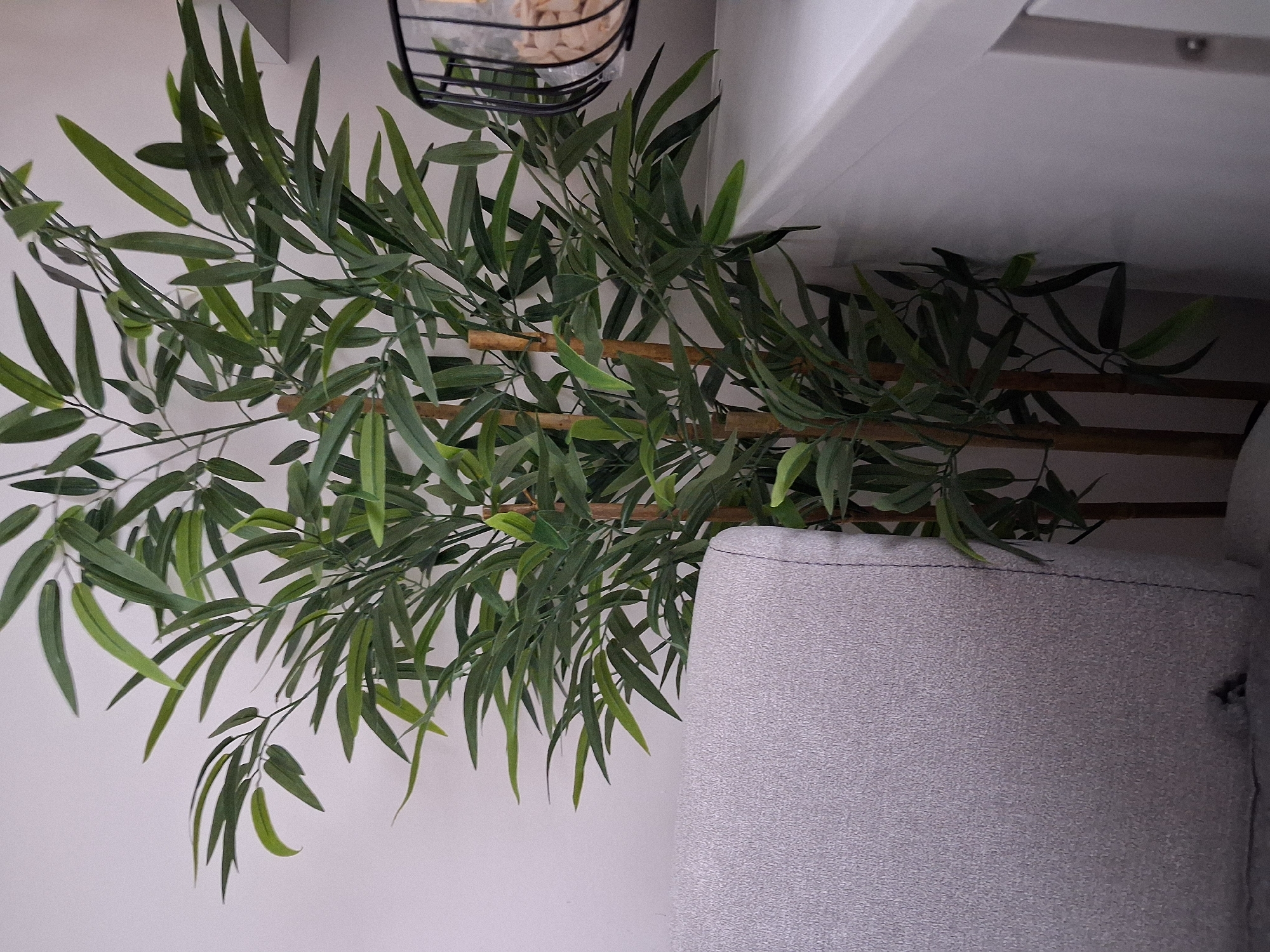 A vertical image displays an indoor scene featuring an artificial bamboo plant against a light-colored wall. The plant, positioned centrally and to the right, exhibits multiple slender brown stems and numerous green, lanceolate leaves. In the lower-left quadrant, the top-rear portion of a light gray upholstered furniture item, possibly an armchair or sofa, is visible, characterized by a textured fabric and a vertical dark stitching line along its right edge. To the upper right, partially obscured by the bamboo foliage, a section of a white horizontal surface, consistent with a shelf or cabinet top, is present. On this surface, a black wire basket containing light-toned, irregularly shaped solid objects is partially visible. No individuals are depicted, nor are there any discernible landmarks or unique features that would allow for the identification of a specific location within the city of Varna, Bulgaria.