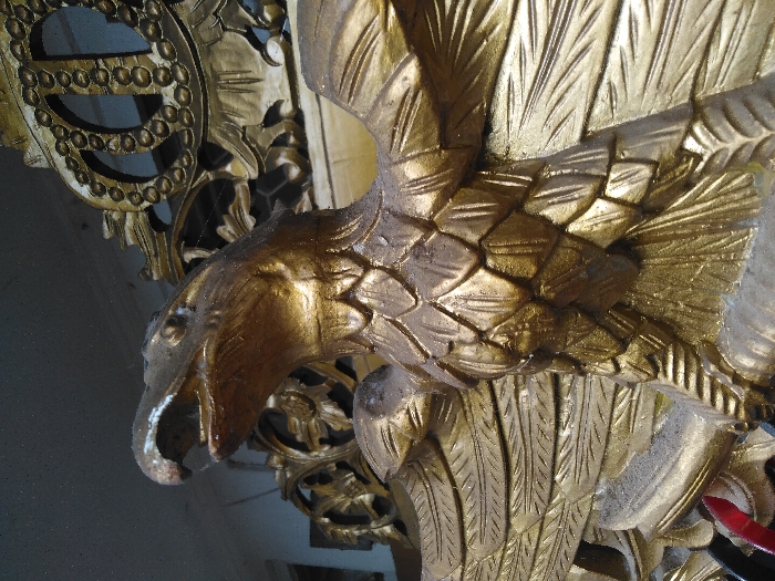 A close-up, upward-angled photograph depicts a gilded, ornate eagle sculpture