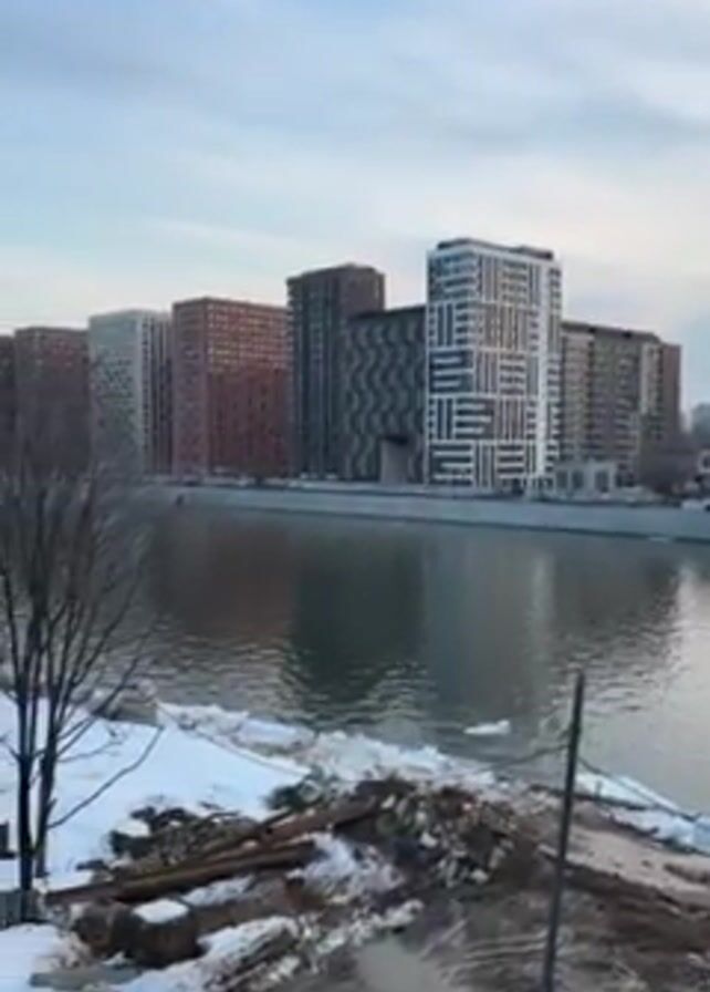 view of a river with modern buildings on the opposite bank. The buildings are various shades of gray, brown, and white, with different patterns on their facades. The river has a slight ripple to it, and there are some patches of ice and snow along the riverbank. The foreground has some snowy patches mixed with dirt and debris. A few bare trees are also visible near the river's edge. The sky is overcast with a blue hue.