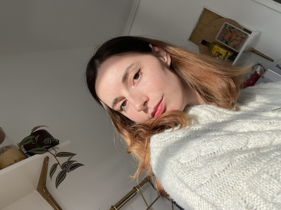 The image presents a close-up, upward-angled portrait of a single female subject within an indoor residential setting, presumed to be a residence in Lille, France. The subject, an adult female, is centrally positioned, directly facing the camera. She has fair skin, illuminated by strong sunlight originating from the right, which casts a defined shadow across the left side of her face. Her medium-length hair transitions from dark at the roots to a lighter auburn or reddish-brown hue. She is wearing a cream-colored, cable-knit sweater with a visible metallic zipper pull. Her lips are adorned with pink lipstick, and her upper eyelids feature dark eyeliner. In the upper left quadrant of the background, a white shelf supported by a gold-toned metallic bracket holds a dark-potted plant, identified by its striped, elongated leaves trailing downwards. In the upper right background, a second white shelf displays a dark bottle, a round wooden cutting board, and a rectangular packaged item featuring a colorful label. The walls are uniformly light-colored. No other individuals or explicit interactions are depicted.