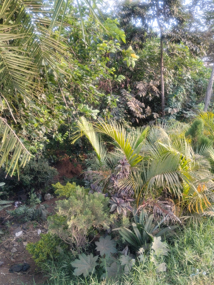 This image depicts a dense botanical scene located within Witeithie ward, Kenya, characterized by lush green foliage under natural daylight. The foreground and midground contain a diverse array of tropical and subtropical plants, including multiple palm species with prominent, fanned fronds, some exhibiting a lighter yellowish-green coloration. Darker green and reddish-purple leafed shrubs are visible centrally and towards the right. A compact, light-green coniferous shrub is situated in the lower-middle, alongside plants with large, palmate leaves. The ground in the lower-left is composed of dark, disturbed soil with scattered organic debris, and a small mound of reddish-brown earth is present in the mid-left. Sparse green grass occupies the immediate foreground on the right. The background consists of a thick, verdant canopy of broadleaf trees and dense undergrowth. No individuals, animals, or man-made structures are visible.