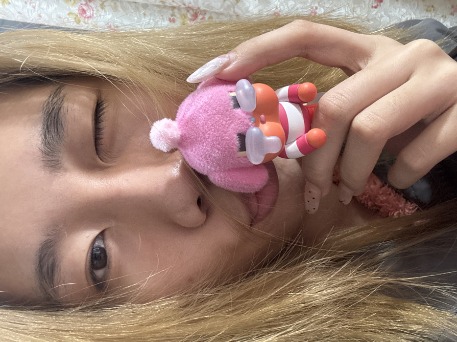 The image displays a partial close-up of an individual located in Shapingba District, China. The subject's left eye is open and directed towards the viewer, while the right eye is closed in a wink. Long, straight, blonde-dyed hair frames the face. The individual's left hand, featuring long, manicured fingernails with a clear polish and small dark polka dot accents on the pinky finger, holds a small, approximately 7-centimeter-tall, collectible toy figure. This figure is characterized by a pink, flocked head with dog-like ears and a small pom-pom on top, an orange face with prominent white/light blue tear streaks, and an orange body adorned with horizontal white and pink stripes. The toy is positioned in front of the individual's lower face, partially obscuring the mouth and chin. The background consists of a light-colored fabric exhibiting a faded floral pattern, consistent with an indoor setting.